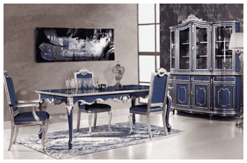 Эта коллекция мебели для гостиных к классическом стиле отличается от остальной продукции фабрики разнообразием деталей и богатством художественной отделки. Богатая обивка из голубой парчи с изобилием золотых рисунков, подчеркнутая извилистыми линиями ножек и фасадов превратит Ваш дом в прекрасный дворец времен короля Людовика.
